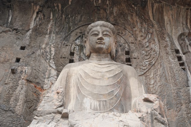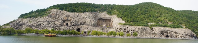 A panoramic view of the ‘Dragon Gate Grottoes’ from across the Yi River (伊河) that gives an idea of its size. There are up to 100,000 Buddhist statues here within the 2,345 caves that were built between the years 493 and 1127. The great statue of the Buddha at the center is 57 feet tall.